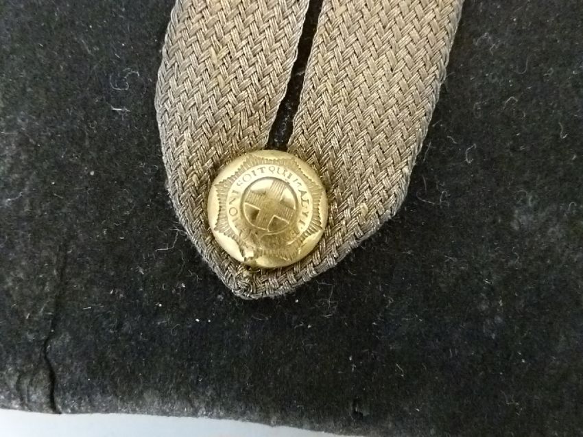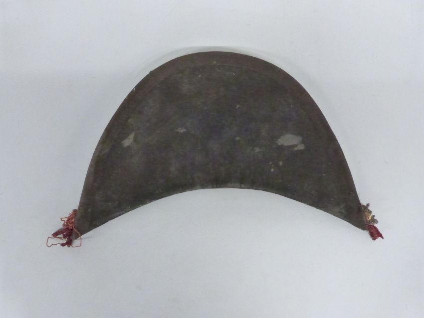 British Army Coldstream Guards bicorn hat, edged in black with wired decoration to the corners, gold tape to the front, rosettes and badge