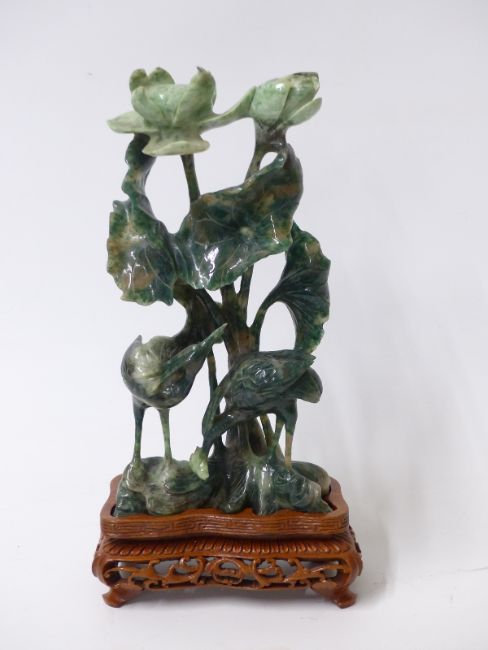 Japanese hardstone carving depicting cranes & lily pads on hardwood stand and in box, 26cm tall