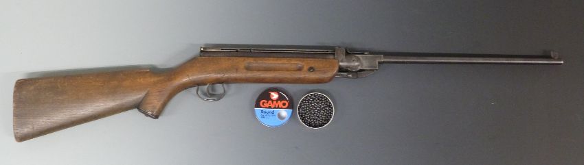 German .177 25 shot ball repeater or single shot pellet air rifle with alignment sights and semi-pistol grip, possibly Original or Diana, serial number 504, together with a tin of Gamo round shot.