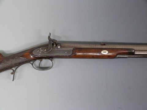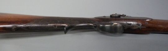 Joseph Harkom of Edinburgh .53 percussion hammer action rifle with named and engraved lock, engraved stylised dolphin hammer, top plate, butt plate, scrolling pineapple finialled trigger guard and mounts, horn tipped forend, brass tipped wooden ram-rod, sling suspension mounts, pop up sights, chequered grip, vacant wrist cartouche and 30 inch octagonal Damascus barrel, overall length 117cm.