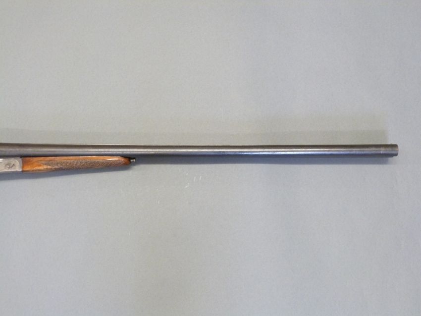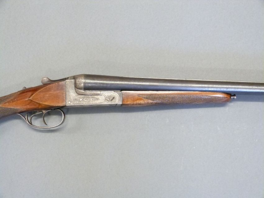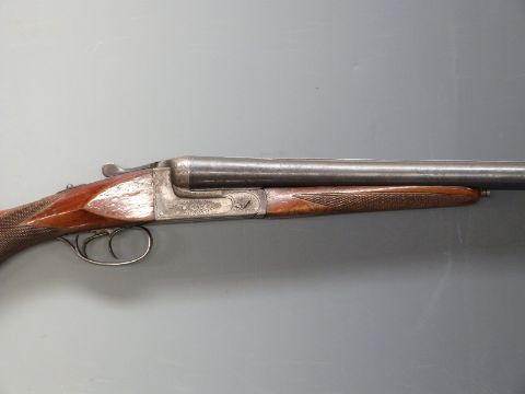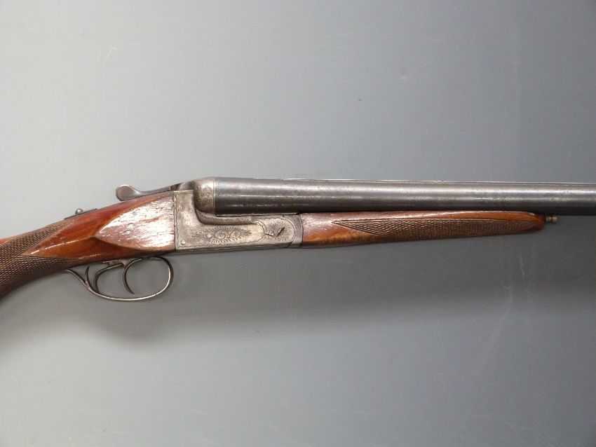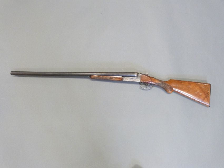Eibar 12 bore side by side shotgun with engraved lock, top plate, top lever, underside and trigger guard, chequered semi-pistol grip and forend, double trigger and named 27.5 inch barrels, overall length 112cm, length of pull 35.5cm, serial number 53964. PLEASE NOTE THAT A VALID RELEVANT FIREARMS/SHOTGUN CERTIFICATE IS REQUIRED TO HANDLE/PURCHASE THIS ITEM.
