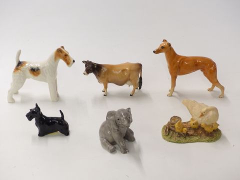 Six Beswick figures including Greyhound, Ayshire cow, Mind How You Go, studio sculptures figures etc