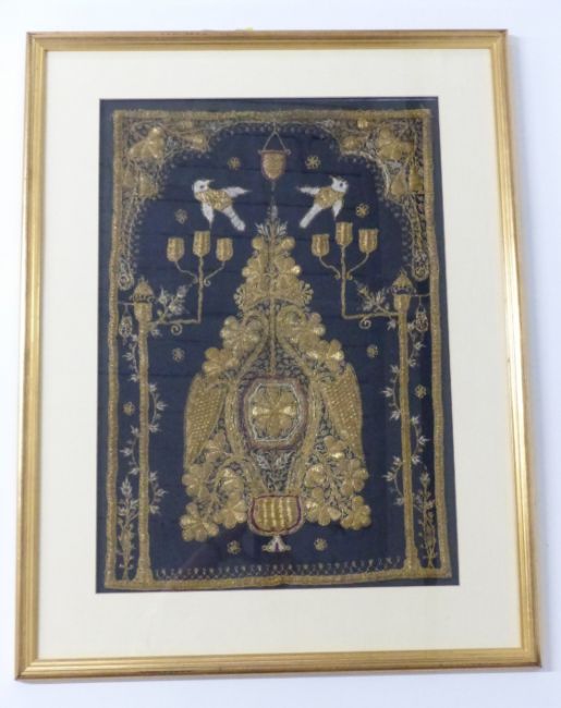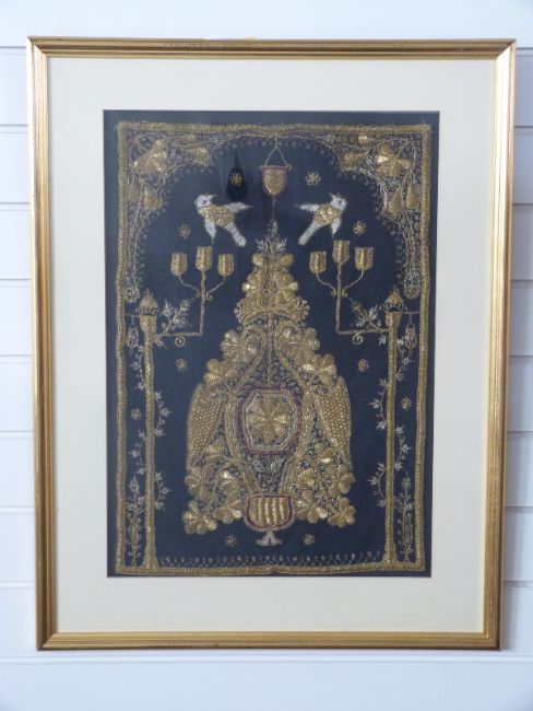 A 19thC/20thC gold thread work embroidery depicting a stylised tree and doves, 60 x 42cm