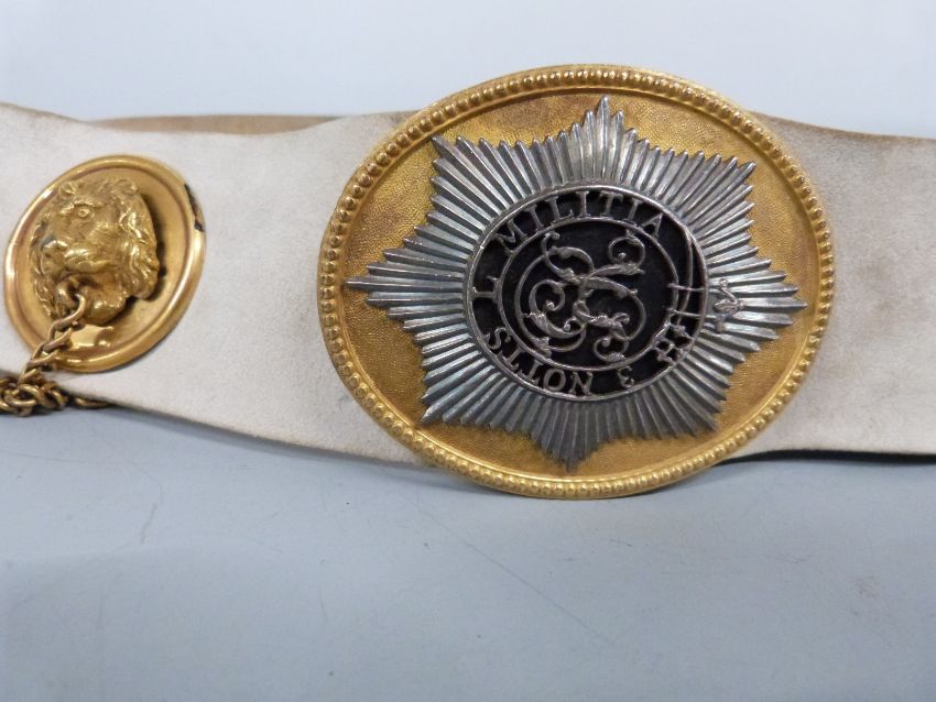 British Army c1810 officer's cross belt and sword sling in leather with Regimental badge of the Nottinghamshire Militia, whistle chain attached to lion's head device and whistle holder. The belt was worn by Taylor White, the second son of Sir Thomas Woollaston White, 2nd Bt