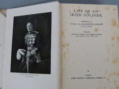 Military book, Life of an Irish Soldier Reminiscences of General Sir Alexander Godley, hardback 1939 first edition, with inscription ' For Tom Dorien Smith R N from the author wishing him the best of luck and happiness, July 21st 1945'