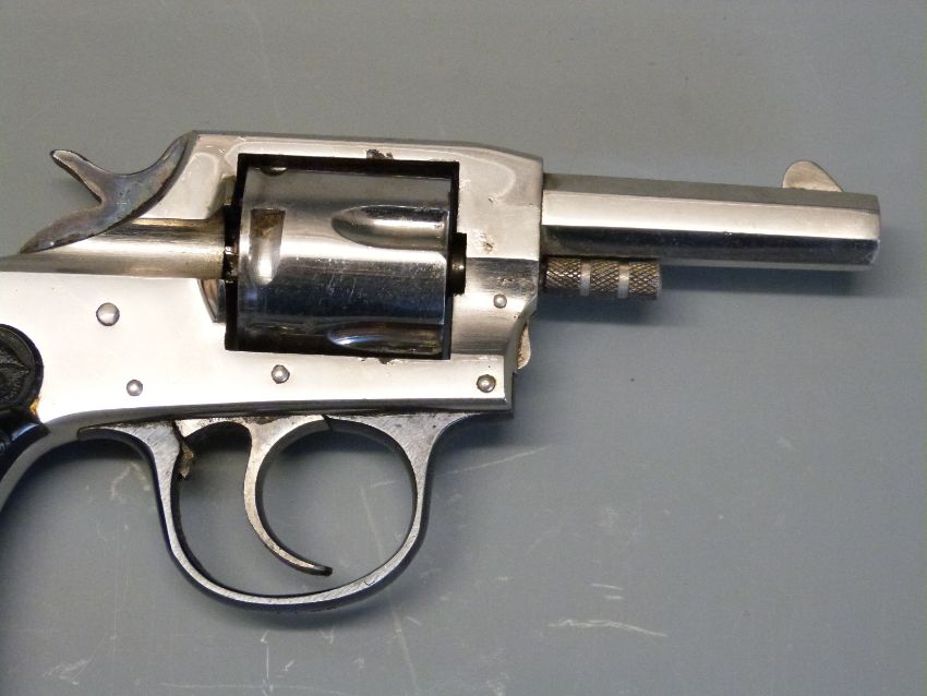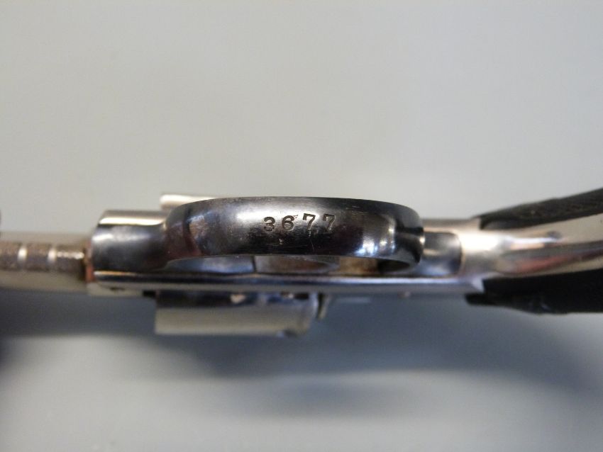 Iver Johnson model 1900 .320 five shot double action revolver with monogrammed moulded grips decorated with owls, top plate engraved 'I J Double Action model 1900 Fitchburg Mass', front sight and 2.5inch barrel, overall length 17.5cm, serial number 3677, in brown leather holster.