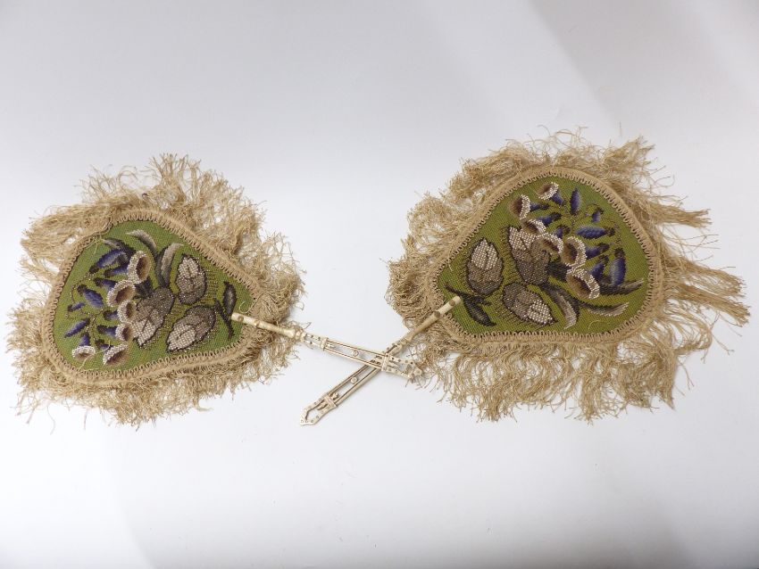 A pair of 19thC inlaid ivory, silk and embroidered beadwork hand held fire screens