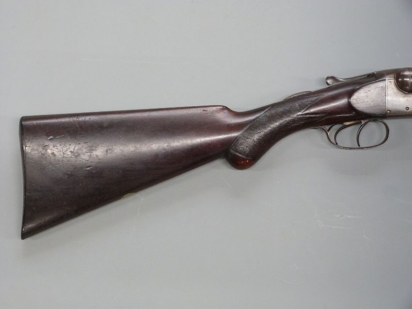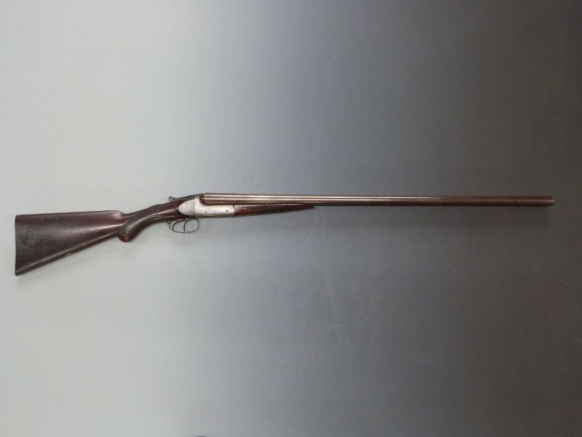 English made 12 bore side by side shotgun with chequered semi-pistol grip and forend, double trigger and 30 inch Damascus barrels, serial number 11336. PLEASE NOTE THAT A VALID RELEVANT FIREARMS/SHOTGUN CERTIFICATE IS REQUIRED TO HANDLE/PURCHASE THIS ITEM.