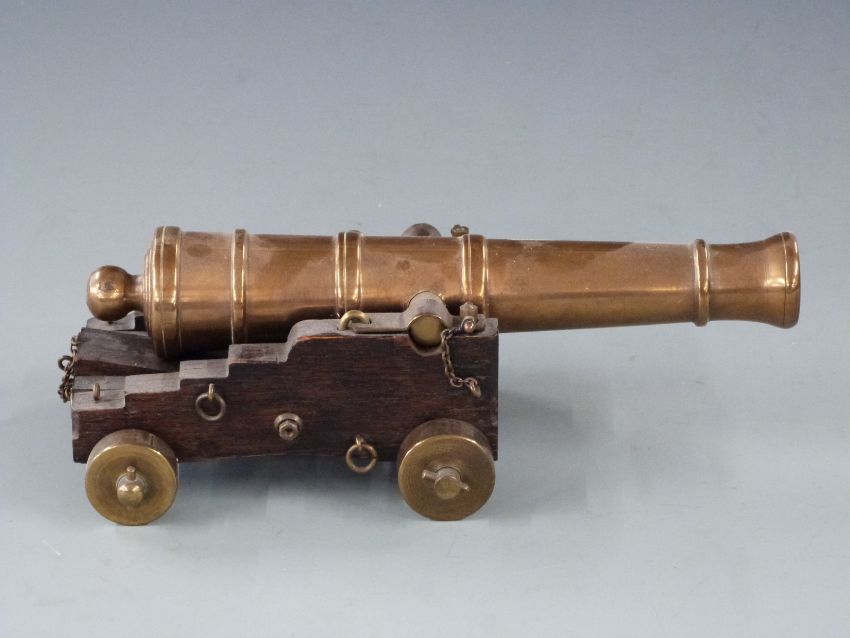Signalling or display model cannon with 29cm graduated brass barrel raised on oak carriage, 36cm long.