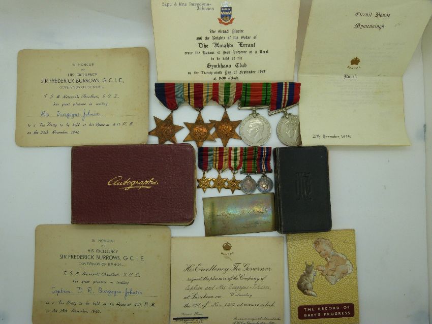 WWII British Army group of five medals comprising 1939-45 Star, Africa Star, Italy Star, Defence Medal and War Medal including a set of miniatures awarded to Captain D R Burgoyn-Johnson together with ephemera and invitations from the Governor of Bengal