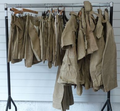 A collection of British Army Tropical uniform including thirteen pairs of shorts three pairs of long trousers, five short sleeve tunics and belts and two long sleeve tunics, various sizes