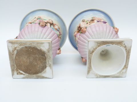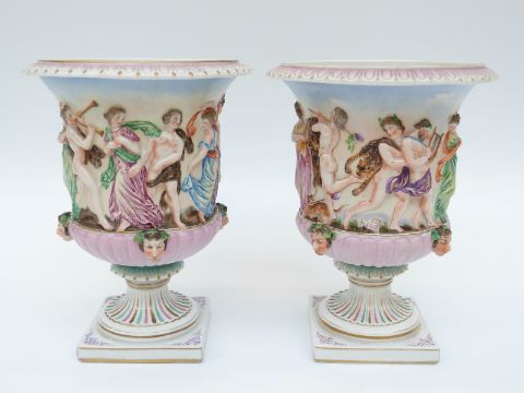 A pair of 19thC Continental campana urns decorated with relief moulded classical scenes