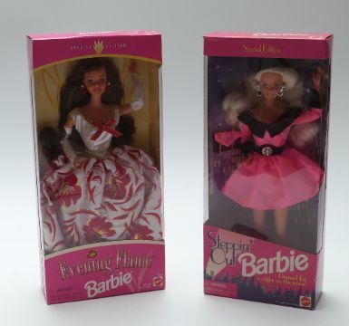 Six Barbie Special Edition dolls Emerald Elegance 12322 signed to front of box, Pink Reflections 19130, Walt Disney World 16525, Evening Flame 15533, Ribbons & Roses 13911 and Steppin Out 14110, all in original boxes