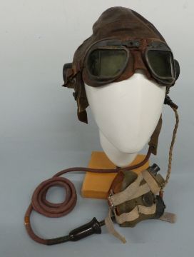 WWI Type C flying helmet with goggles, tinted lenses and oxygen mask