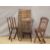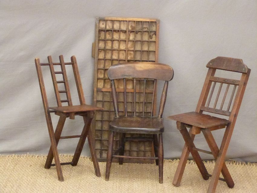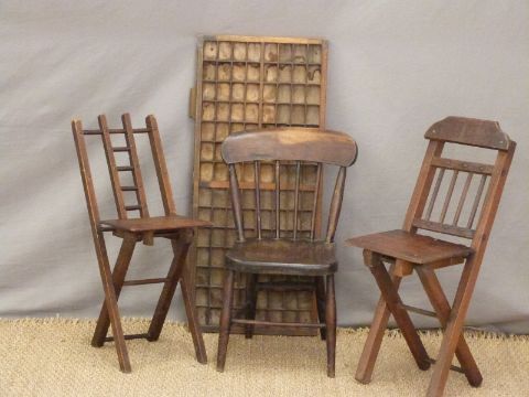 A printer's tray, child's chair, two folding chairs