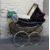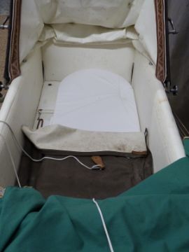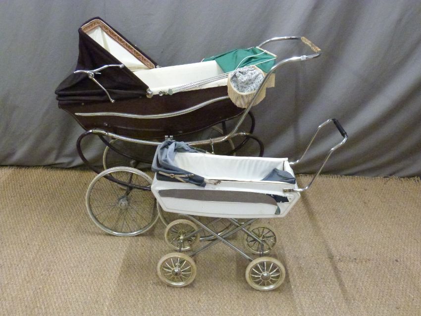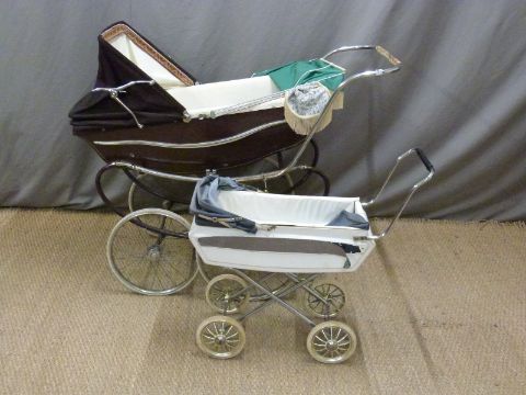 Marmet vintage pram in brown with hood and cover with an additional green fringed canopy, 92cm approx and a Raleigh vintage dolls pram in white and grey with hood and cover, 62cm approx