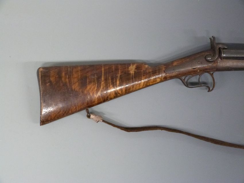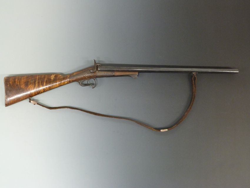 Vasselon of Marseille 16 bore side by side pinfire hammer action shotgun with named and engraved locks, engraved top plate, rotary underlever and shaped trigger guard, double trigger, brown leather sling and 23 inch barrels, overall length 98cm.