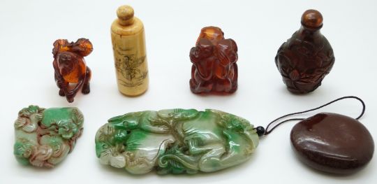 Chinese scent bottle, netsuke depicting the three wise monkeys, carved Chinese hardstone, bone scent bottle etc