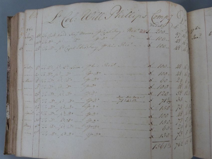 Dover Castle 1762 / 1763 hand written cash or similar book, each pair of pages for a different person, company or group, some significant sums of £1000's are mentioned along with a tally of the number of muskets, bayonets etc handed out to each military group