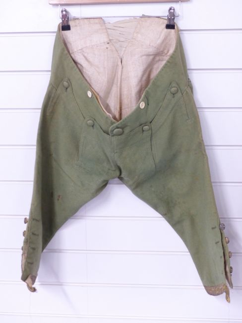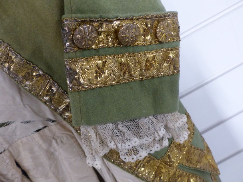 Georgian gentleman's frock coat, waistcoat and trousers in green cloth, the coat and waistcoat decorated with gold braid and gold buttons, the cuffs with lace.