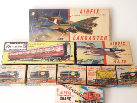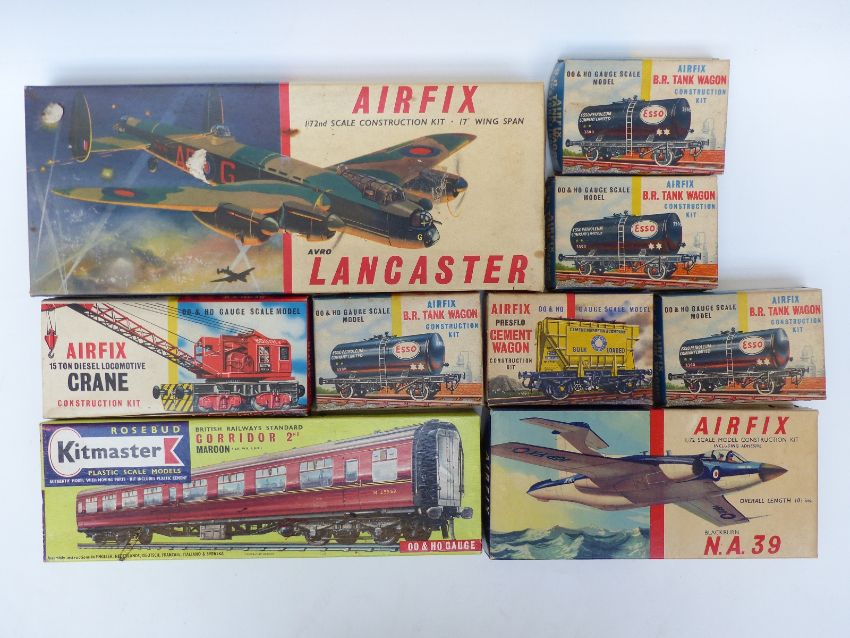 Nine Airfix and Kitmaster 00 gauge kits comprising mainly railway wagons and coaches, all in original boxes.