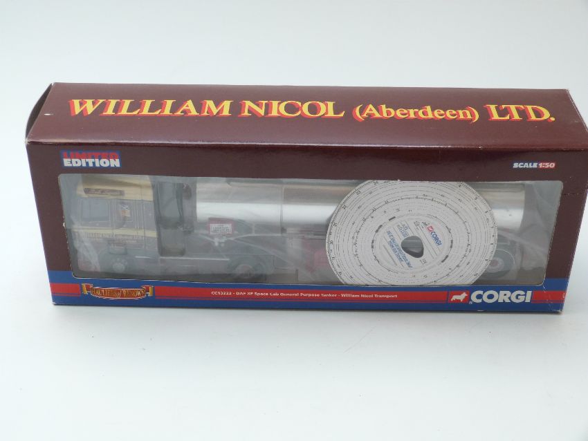 Three Corgi limited edition diecast model lorries comprising Hauliers of Renown William Nicol (Aberdeen) Ltd DAF XF Space Cab General Purpose Tanker CC13222, S.W. Wreford & Sons Ltd DAF XF Curtainside CC13216 and Eddie Stobart Ltd MAN TGA Curtainside, all in original boxes.
