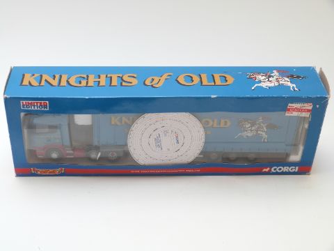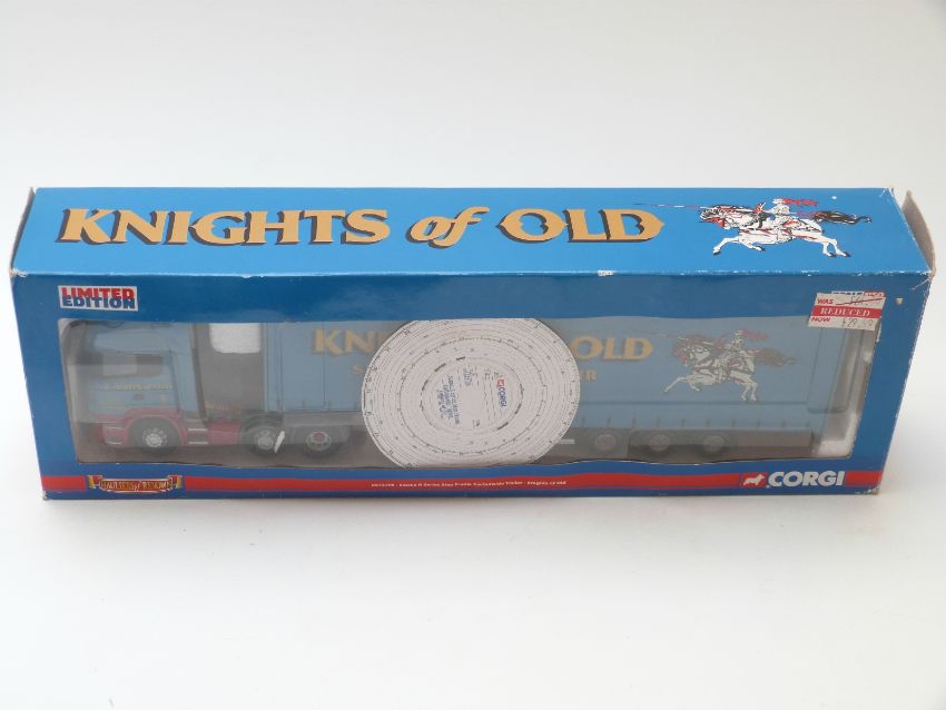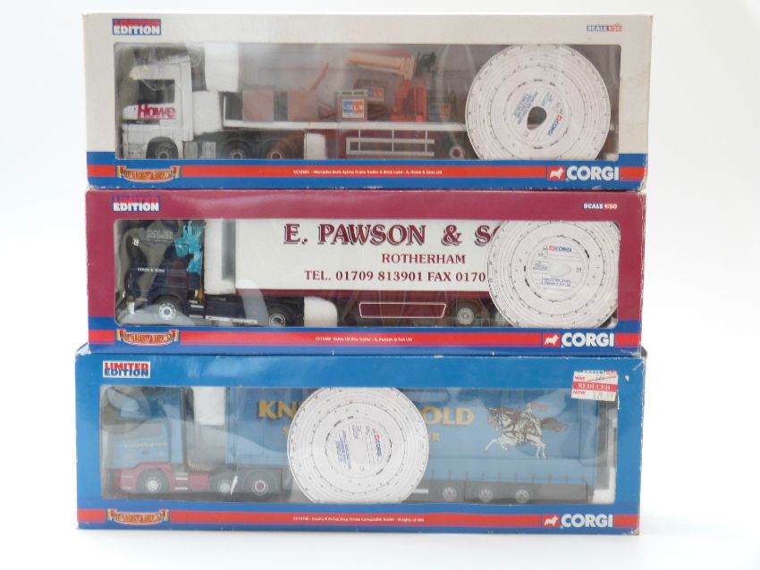 Three Corgi Hauliers of Renown limited edition diecast model lorries comprising Knights of Old Scania R Series Step Frame Curtainside Trailer CC13706, A. Howe & Sons Ltd Mercedes-Benz Actros Crane Trailer & Brick Load CC13804 and E. Pawson & Son Ltd Volvo FM Box Trailer CC13506, all in original boxes.