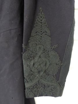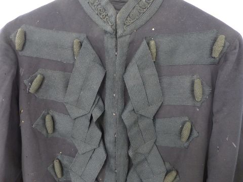 A British Army Victorian Cavalry officer's frock coat in black cloth with black braid to collar, sleeves & back, six double rows of drops and loops with black corded toggles, hook and eye fastenings to front and two rear pockets with tassel decoration. Part of the Sir Thomas Woollaston White collection