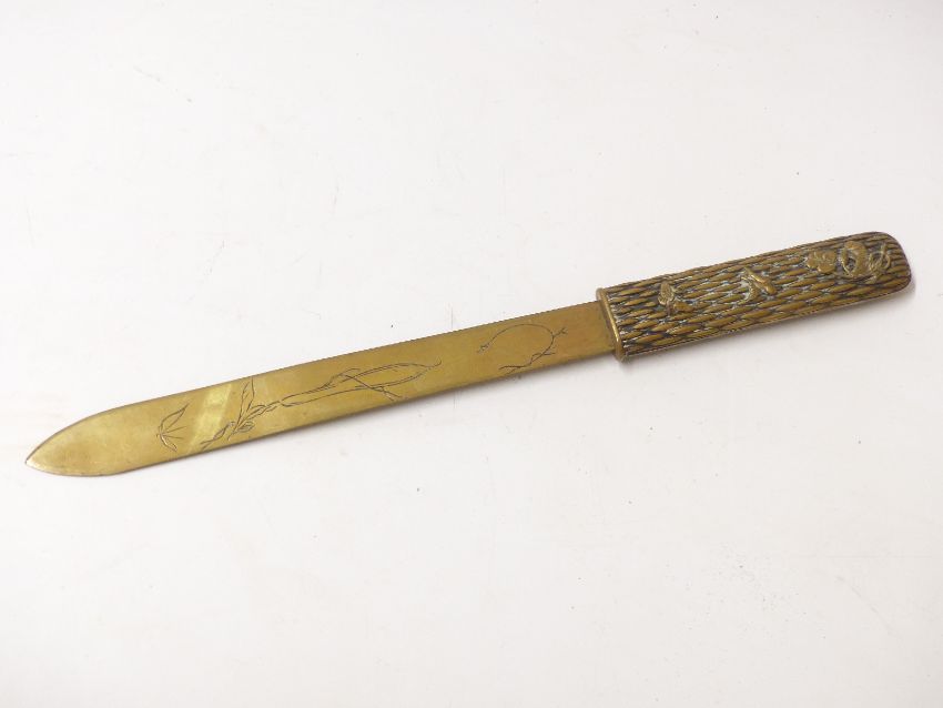 Japanese Meiji period box with relief gilt decoration of a bird and floral sections and a Japanese page turner with similar decoration