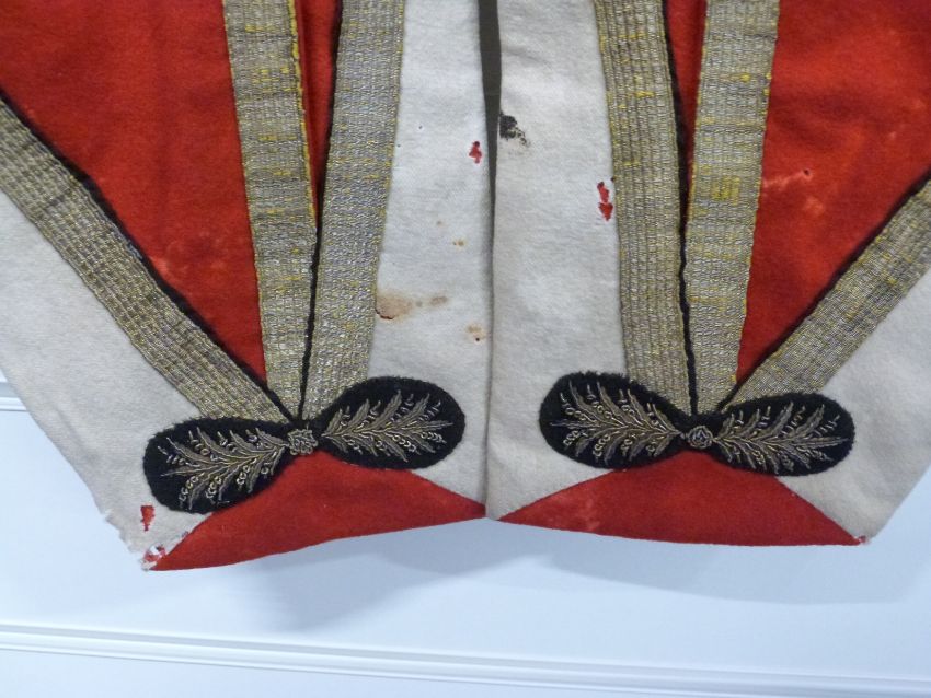 British Army officer's redcoat coatee for the Nottingham Loyal Volunteers c1803, the facings in black velvet with gold tape edging to collar, cuffs, front and back and regimental buttons displayed in pairs, formerly the property of Sir Thomas Woollaston White, 1st Bt and founder of the regiment and consigned by a direct descendant