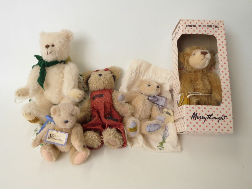 Five various Teddy bears including Muffy Vanderbear, Libearty, Merrythought etc, one in original box, largest 33cm tall