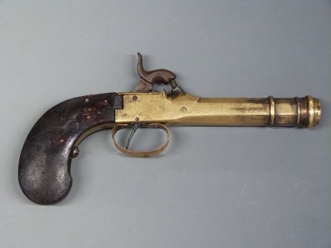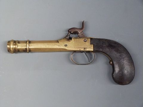 Belgian brass percussion hammer action pocket pistol with shaped wooden grip and 3.5 inch cannon barrel, overall length 21cm.