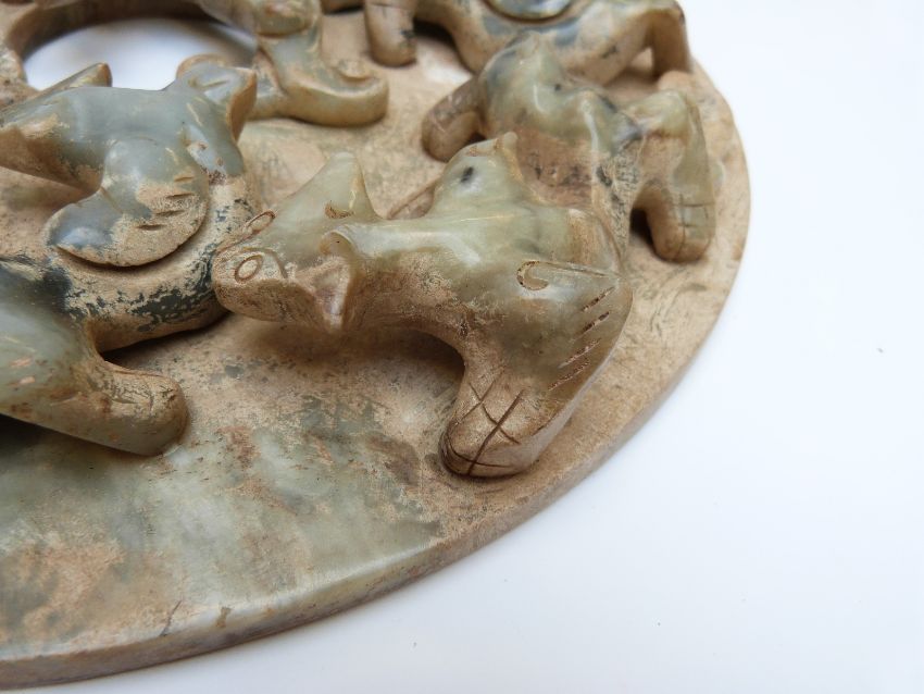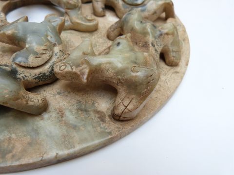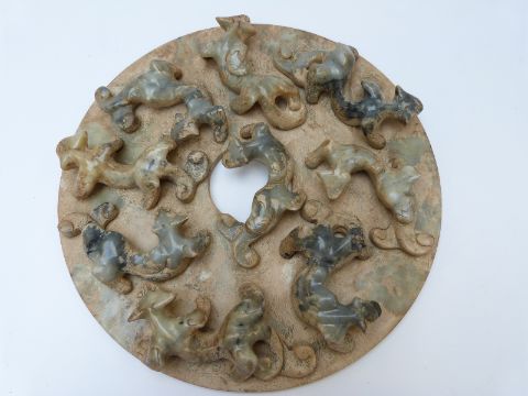 Chinese jadeite style disc with applied decoration depicting chilong, 29cm diameter