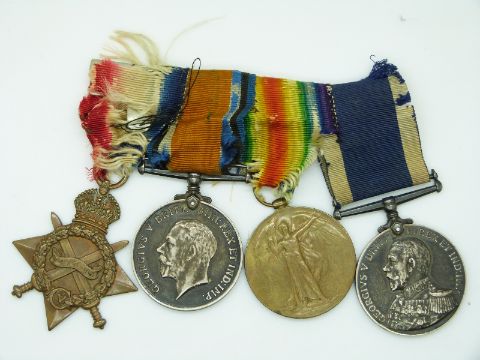 WWI medal group comprising 1914 - 1915 Star, War Medal, Victory Medal named to J 17314 C.F.W Fice Royal Navy together with For Long Service and Good Conduct medal, H.M.S. Valiant, a 1914 Christmas tin and various postcards and photographs