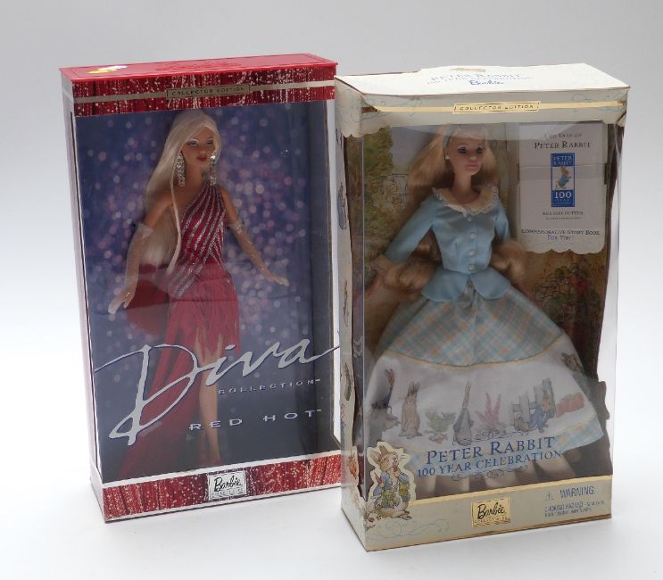Six Barbie Collectibles Collector Edition dolls Diva Collection All That Glitters 55426, Gone Platinum 52739 and Red Hot 56707, Peter Rabbit 100 Year Celebration 53872 Celestial Collection Morning Sun Princess 27688 and Classic Ballet Series Flower Ballerina from The Nutcracker 28375, all in original boxes