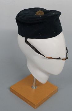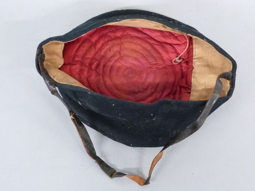 Victorian c1850 Sherwood Rangers Yeomanry Cavalry officer's pillbox or forage cap, formerly property of Sir Thomas Woollaston White, 2nd Bt. Black cloth with leather strap, crimson cloth interior and leather sweat band