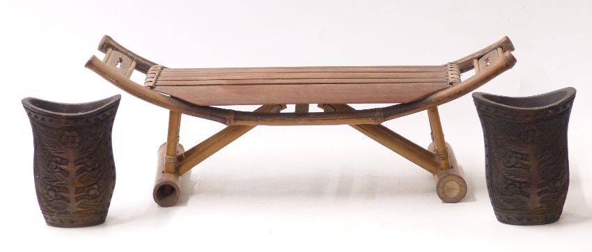 A pair of 19th / 20thC Chinese carved wooden brush pots and a bamboo pillow