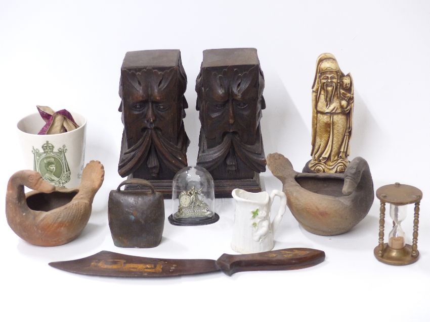 Two carved finials with 'Green Man' decoration, Chinese ceramic bird bowls, egg timer, ceramics etc (12)