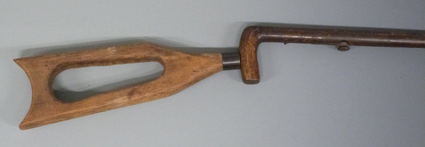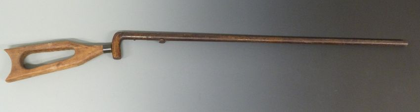 26 bore percussion underlever hammer action walking stick shotgun with screw on skeleton stock and 28 inch barrel, overall length 117cm.