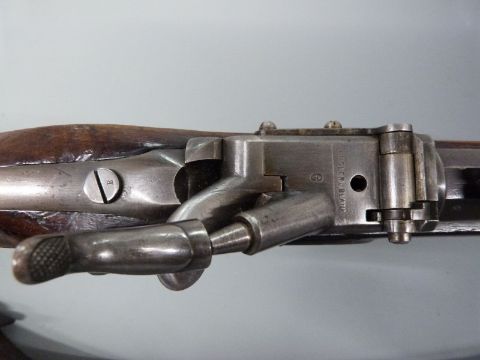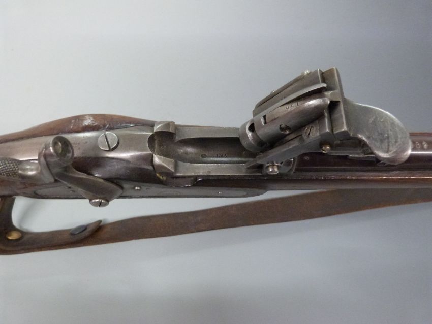 Beuret-Freres Amsler Milbank trapdoor rifle with lock engraved Beuret-Freres Liege, steel spurred trigger guard, ram-rod, butt plate and mounts, adjustable alignment sight, brown leather sling, top plate engraved Amsler/Blank, shaped stock stamped K L 187 and 34 inch rifled barrel also stamped K L 187, overall length 131cm, serial number 961.