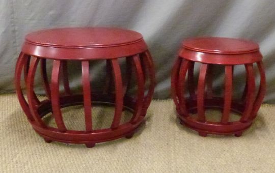Two red Chinese lacquer coffee tables, largest 60cm diameter x 52cm tall, 41cm diameter x 47cm tall