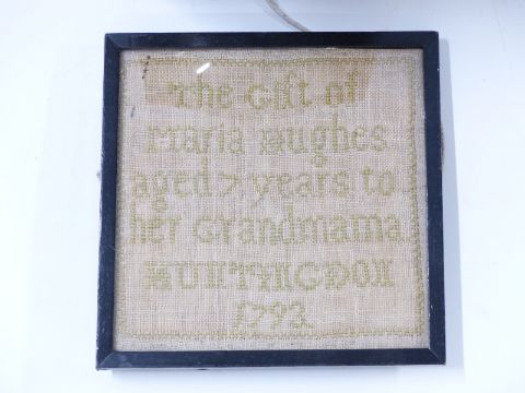 A wooden mantel clock, two samplers