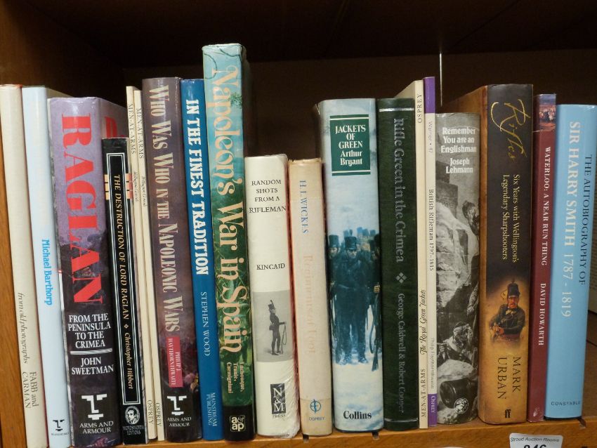 Approximately 20 military books covering Napoleonic wars and Crimea including Napoleon's War in Spain, Raglan from the Peninsula to the Crimea, Rifles, Six Years with Wellington's Legendary Sharp Shooters etc