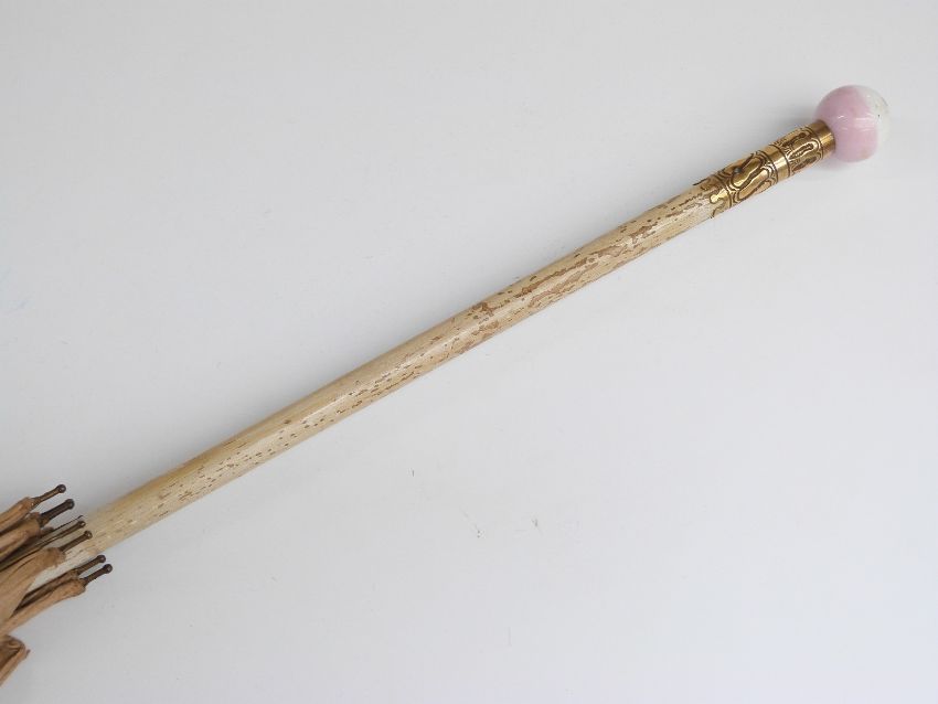 A 19thC/20thC parasol with spherical porcelain handle decorated with Watteau scene, yellow metal collar and painted wooden stick, 89cm, the knop 2.8cm