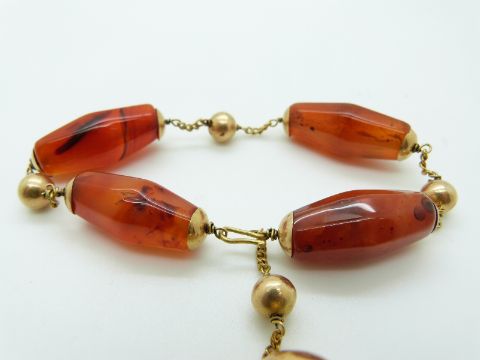 A gold bracelet of faceted barrel shaped carnelian agate beads with alternating gold spherical beads