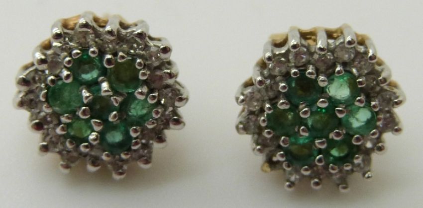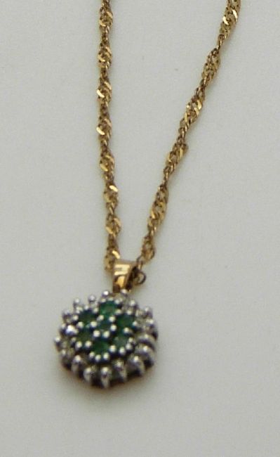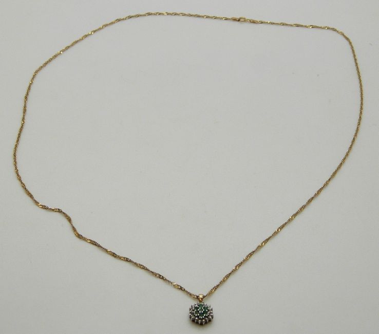 A 9ct gold pendant set with emeralds and diamonds in a cluster with matching earrings and a 9ct gold chain, 5.83g