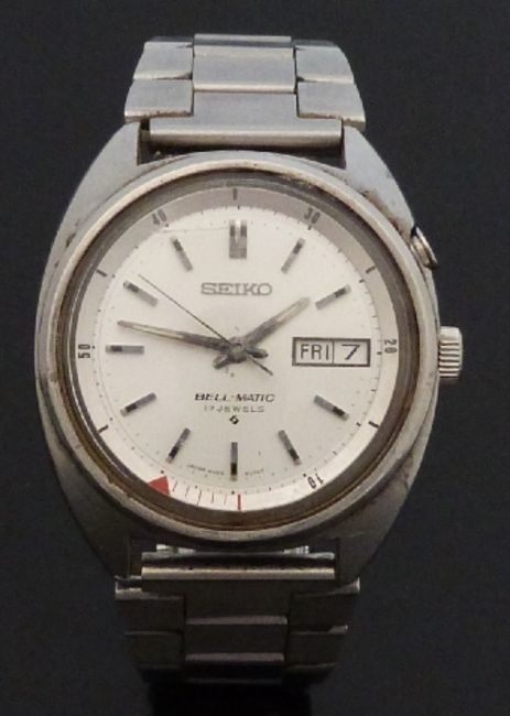 Seiko Bell-Matic stainless steel gentleman's wristwatch ref. 4006-6011 with alarm function, day and date aperture, luminous hands and markers, silver face and automatic 17 jewel movement, on stainless steel bracelet, case diameter 38mm, serial number 161829.