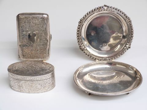 Hallmarked silver cigarette case and two hallmarked silver trays, width of larger 10cm, weight 129g and a continental oval plated box