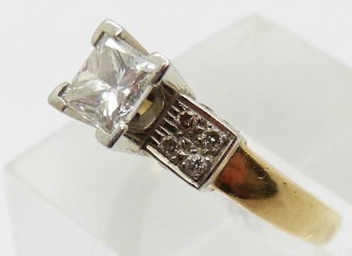 A 18ct gold ring set with a princess cut diamond of approximately 0.6ct and four diamonds to each shoulder in a platinum setting, size J/K