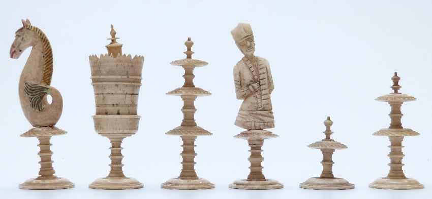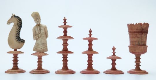 An 18thC German figural bone chess set with turned and carved pieces, one side stained red, with Christie's label, height of king 8cm